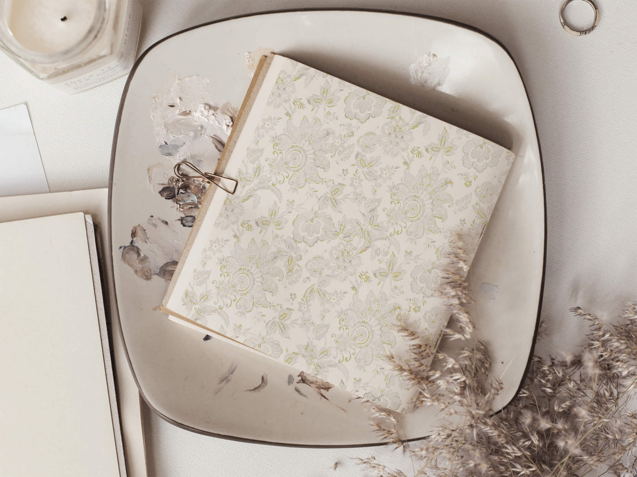 Gilded Grace blends intricate florals, ornate geometrics, and subtle textures, layering sophistication and warmth in a perfectly balanced palette of silver and gold against muted beige.
