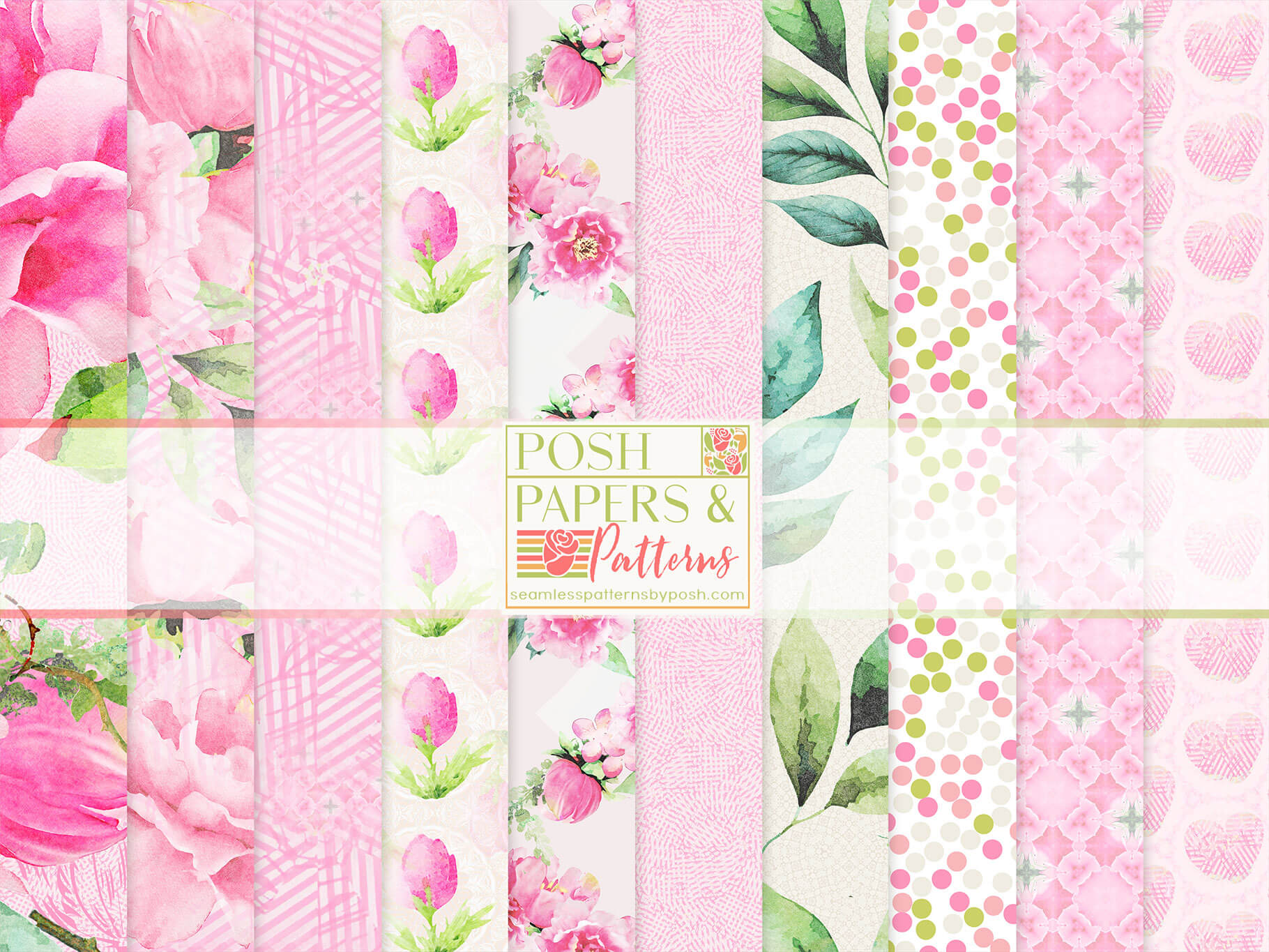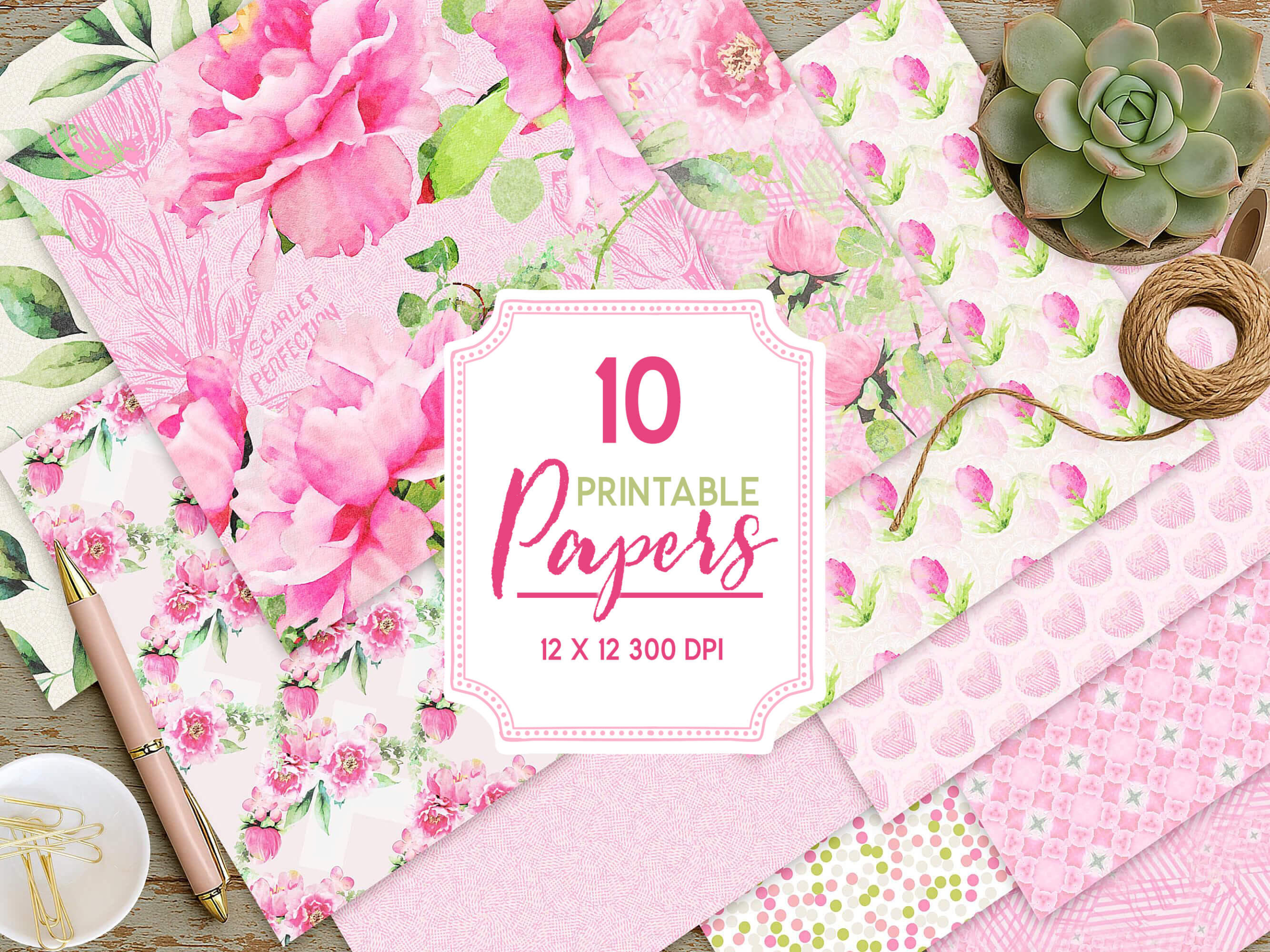 Pink Floral Printable Scrapbook Papers Vol 4—a chic collection featuring original watercolor peonie blooms, elegant greenery, and stylish polka dots. Each high-resolution (300 DPI) 12×12″ JPG is designed for crisp, vibrant prints and seamless use in digital and print projects.