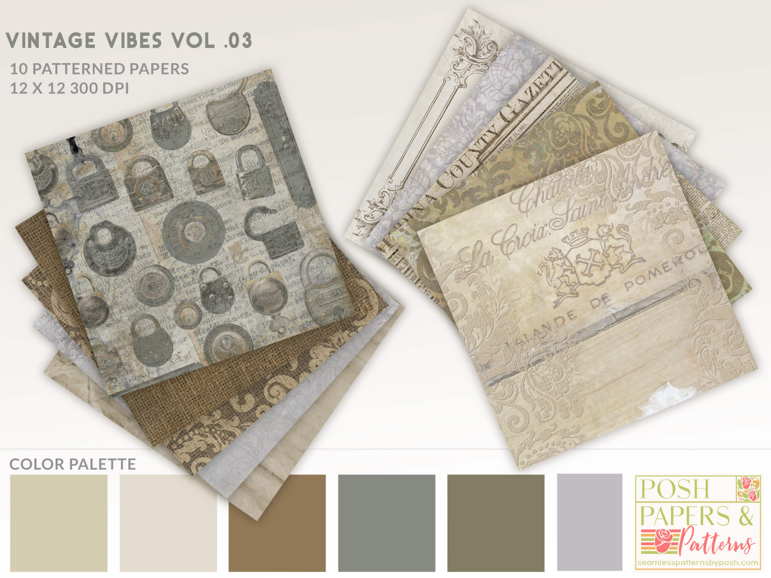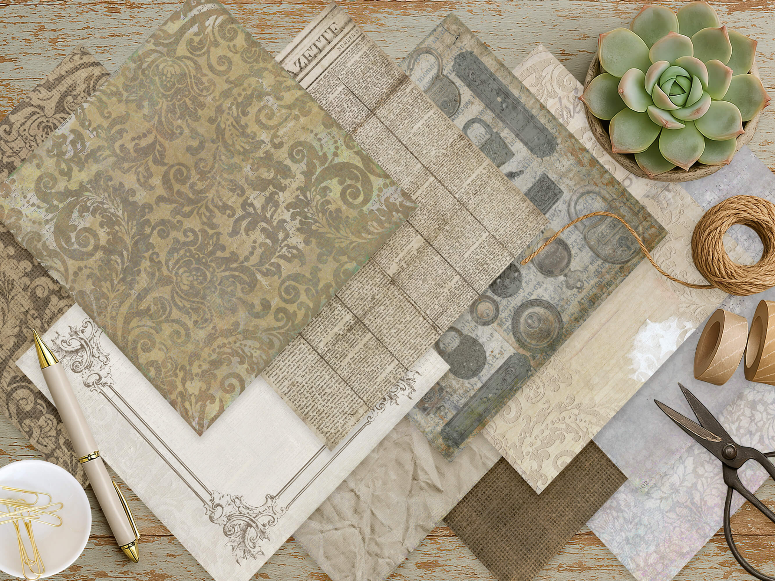 Bring timeless elegance and nostalgic charm to your creative projects. Vintage Vibes Vol 3 Printable Scrapbook Paper Set features sophisticated shabby chic and antique designs, this digital collection features beautifully distressed textures, script accents, and ornate damask patterns in a harmonious neutral palette.